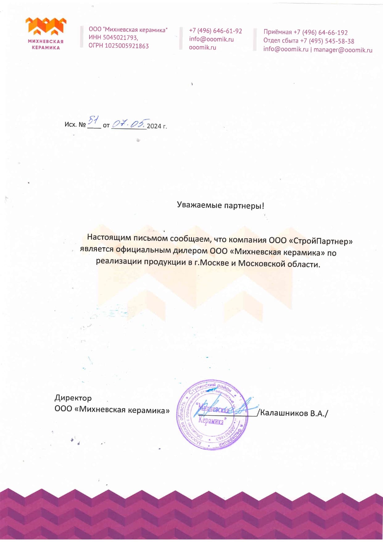 Официальным дилером завода "Михневская керамика" является компания "Стройпартнер".