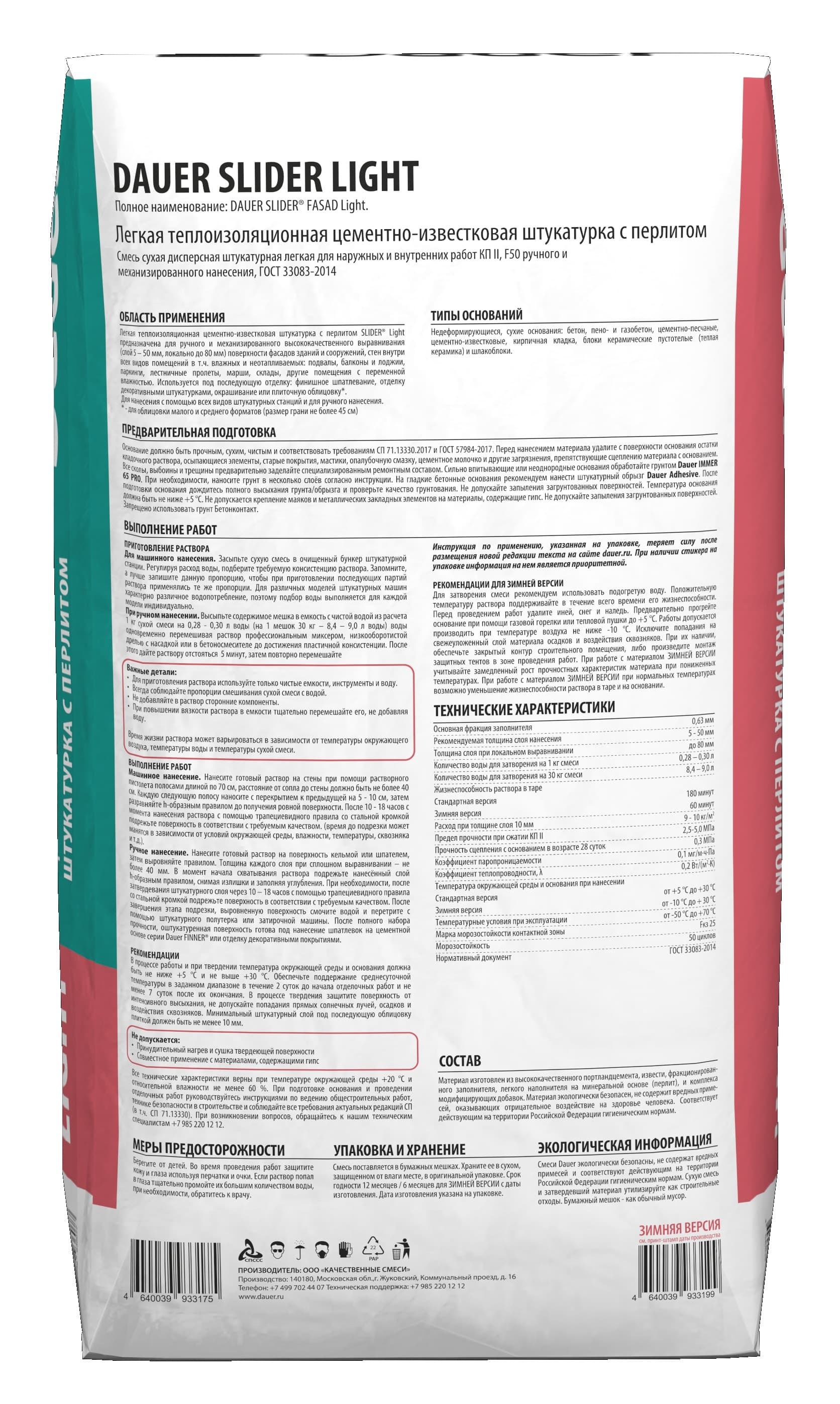 Dauer SLIDER FASAD Light обладает низким расходом и высокими теплоизоляционными свойствами. Идеальна для выравнивания слабых оснований и оснований из керамических пустотелых блоков (теплая керамика).