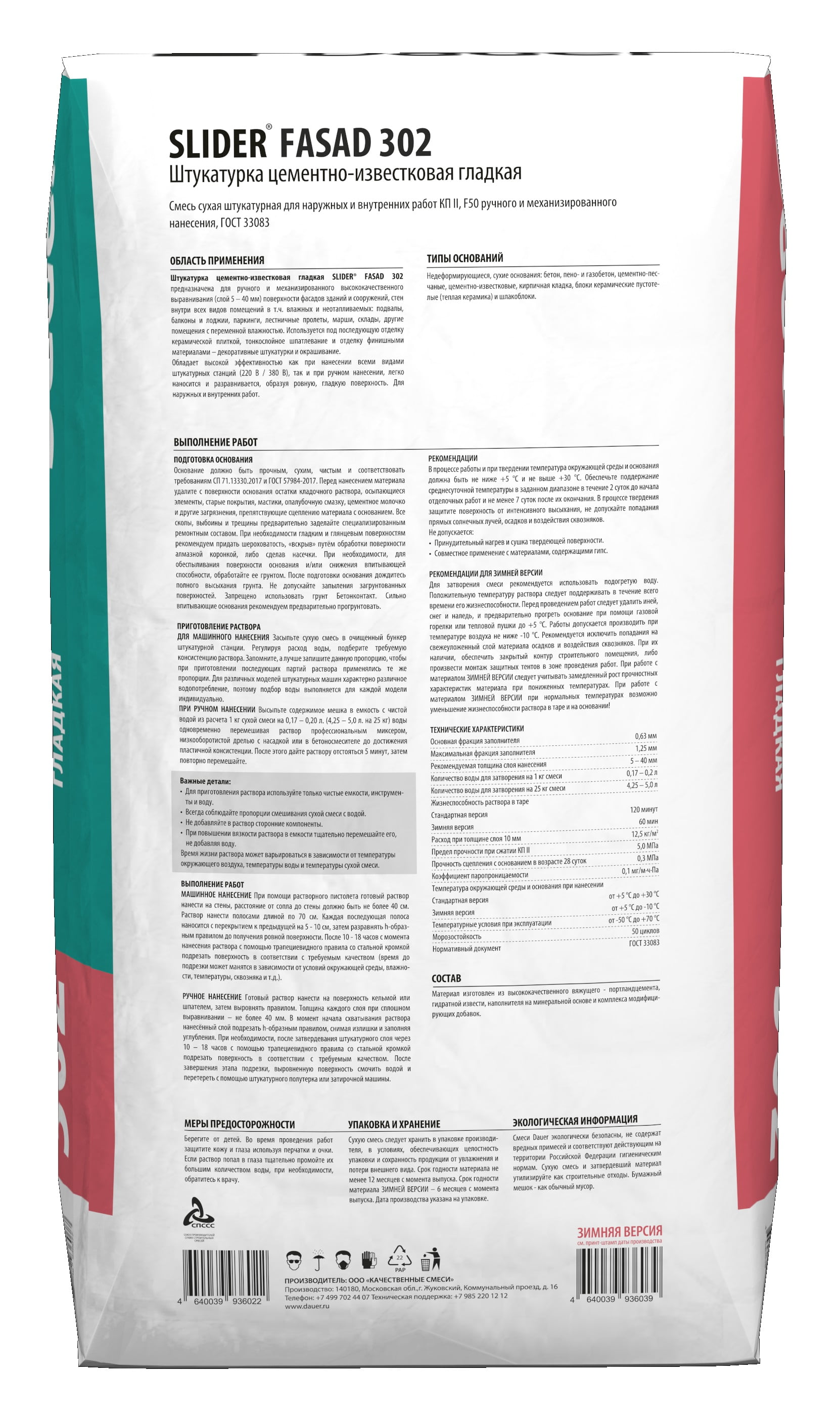Dauer SLIDER FASAD 302 обладает высокой эффективностью как при нанесении всеми видами штукатурных станций, так и при ручном нанесении, легко наносится и разравнивается, образуя ровную, гладкую поверхность.