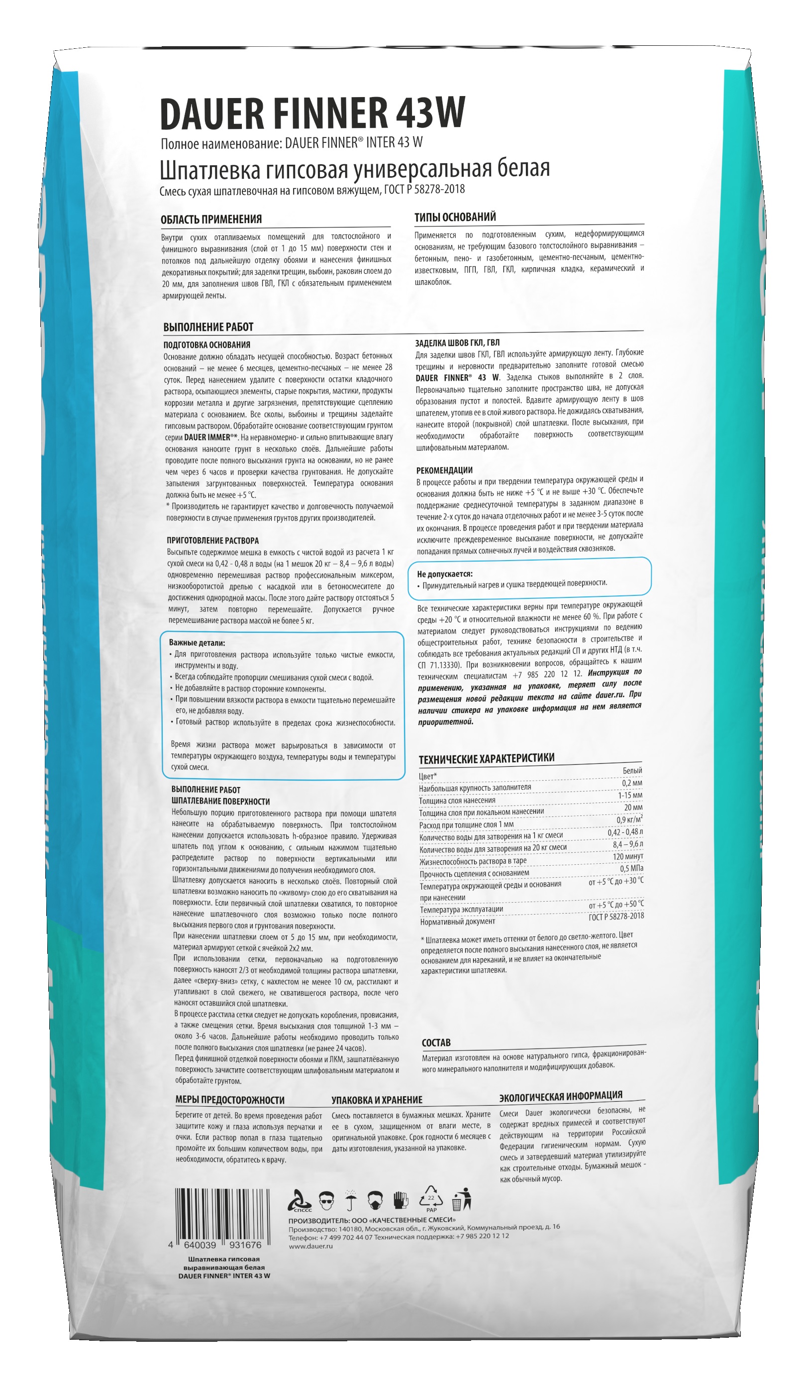 Предназначена для толстослойного и финишного выравнивания (слой от 1 до 15 мм) поверхности стен и потолков под дальнейшую отделку обоями и нанесения финишных декоративных покрытий; для заделки трещин, выбоин, раковин слоем до 20 мм, для заполнения швов ГВЛ, ГКЛ с обязательным применением армирующей ленты.