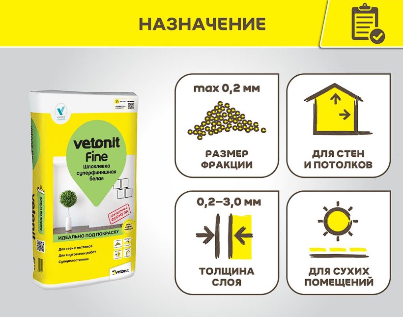 Ветонит Файн это суперфинишная шпаклевка на полимерном связующем, Мельчайшая фракция зерна от 0.2 мм позволяет достигнуть супер тонкого слоя и равномерного распределения на обрабатываемой поверхности. Доставка бесплатная при заказе полной машины 20 тонн.