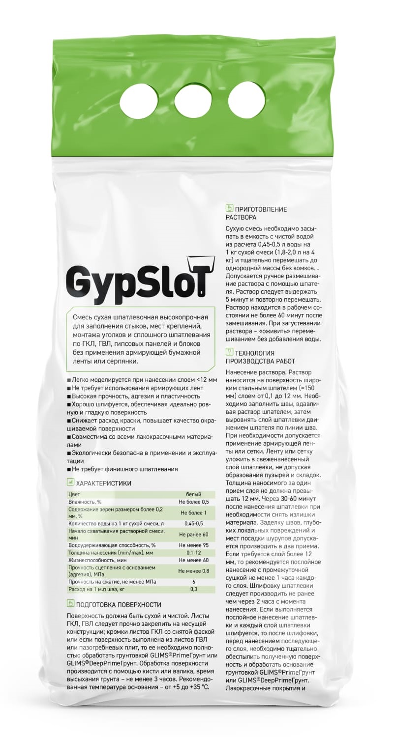 GLIMS GypSlot гипсовая белая высокопрочная для заделки швов без серпянки, для монтажа штучных элементов и защитных уголков в сухих и умеренно влажных помещениях.