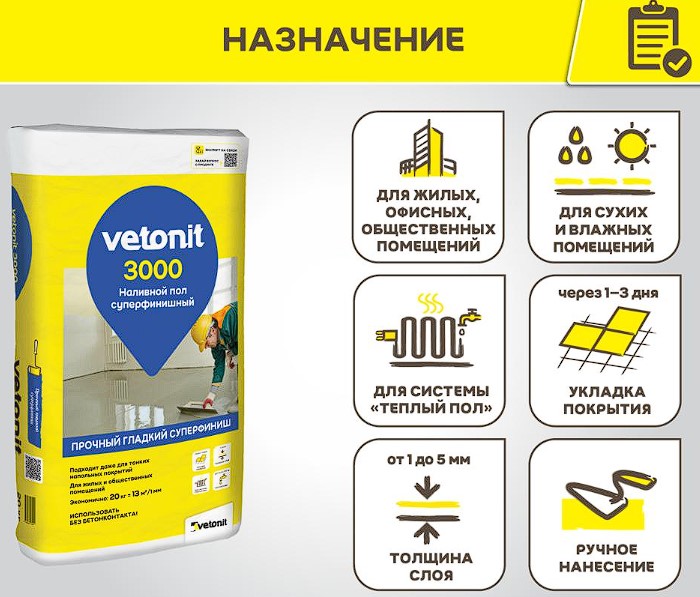 Наливной пол Ветонит 3000 - предназначен для суперфинишного выравнивания под дальнейшую укладку покрытий. Подходит в качестве финишного слоя системы «Теплый пол». Для ручного нанесения внутри помещений. Доставка бесплатная при заказе полной машины 20 тонн.