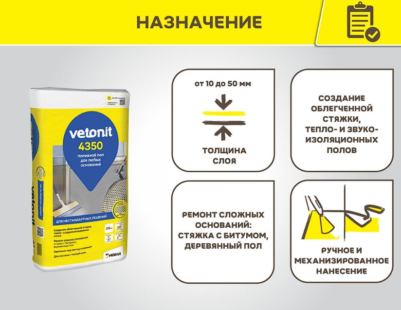 Ветонит 4350 это самовыравнивающийся наливной пол на цементной основе, усиленный армирующим волокном. Это прекрасное решение для ремонта сложных оснований (например, стяжка с битумом в старых домах). Доставка бесплатная при заказе полной машины 20 тонн.