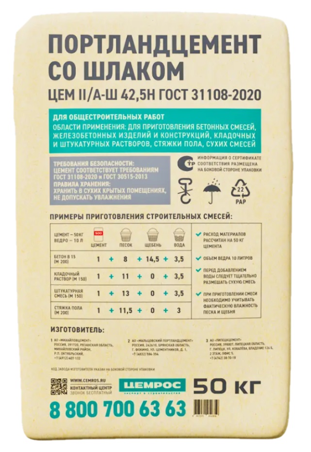 ЦЕМ II/А-Ш 42,5Н М500 Д20 ЦЕМРОС – портландцемент типа ЦЕМ II со шлаком (Ш) от 6% до 20%, класса прочности 42,5, нормальнотвердеющий. Имеет повышенные характеристики за счет присутствия в составе добавок (до 20%).