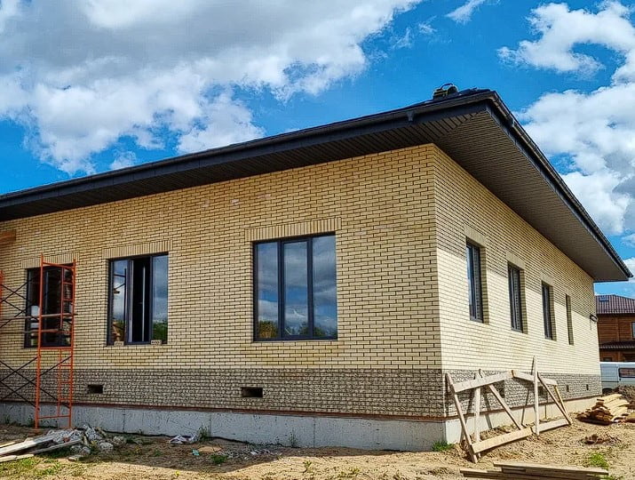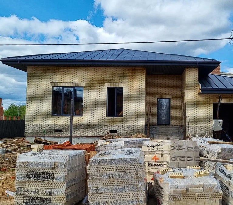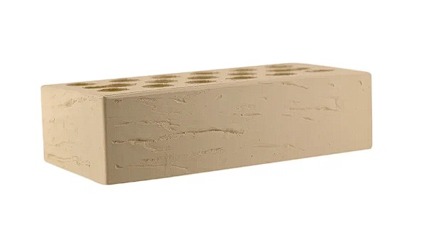 Лицевой кирпич с фаской от завода Керма. Кирпич евро-формата (в кладке выглядит, как одинарный) качества выше среднего с гладкой поверхностью, светлого оттенка, аналогичен цвету «слоновая кость».