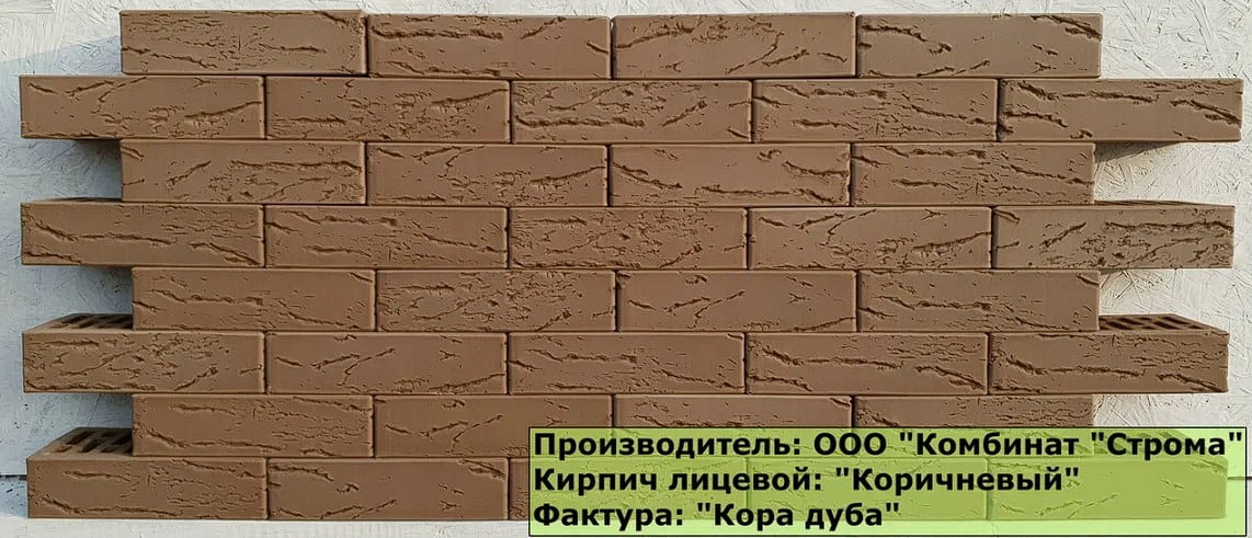 Пустотелый лицевой кирпич формата 1НФ цвета Коричневый, с поверхностью кора дуба и с маркой прочности М175 бренда «Строма».