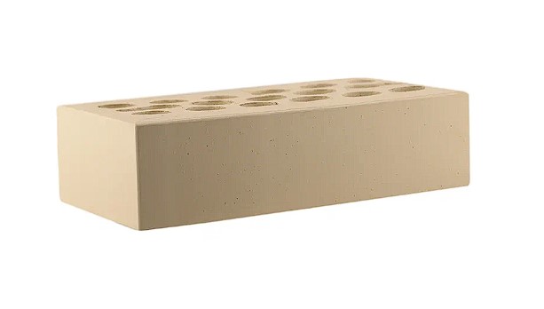 Лицевой кирпич с фаской от завода Керма. Кирпич евро-формата (в кладке выглядит, как одинарный) качества выше среднего с гладкой поверхностью, светлого оттенка, аналогичен цвету «слоновая кость».