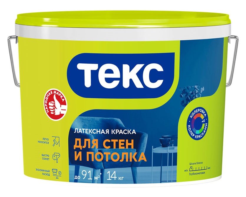 ТЕКС Универсал это интерьерная краска для стен и потолков, используется внутри сухих помещений, Степень блеска глубокоматовый.