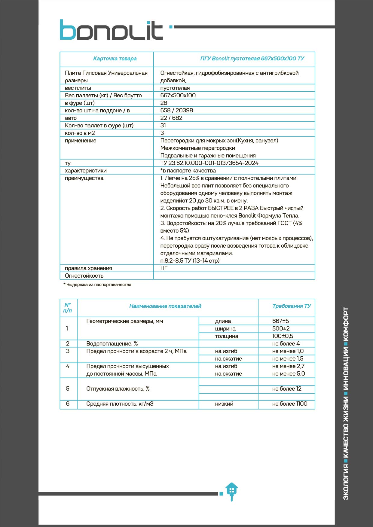 Плита гипсовая универсальная Bonolit (ПГУ) предназначена для быстрого возведения перегородок и ненесущих стен во влажных, подвальных, гаражных помещениях, а также для ненесущих стен жилых помещений.