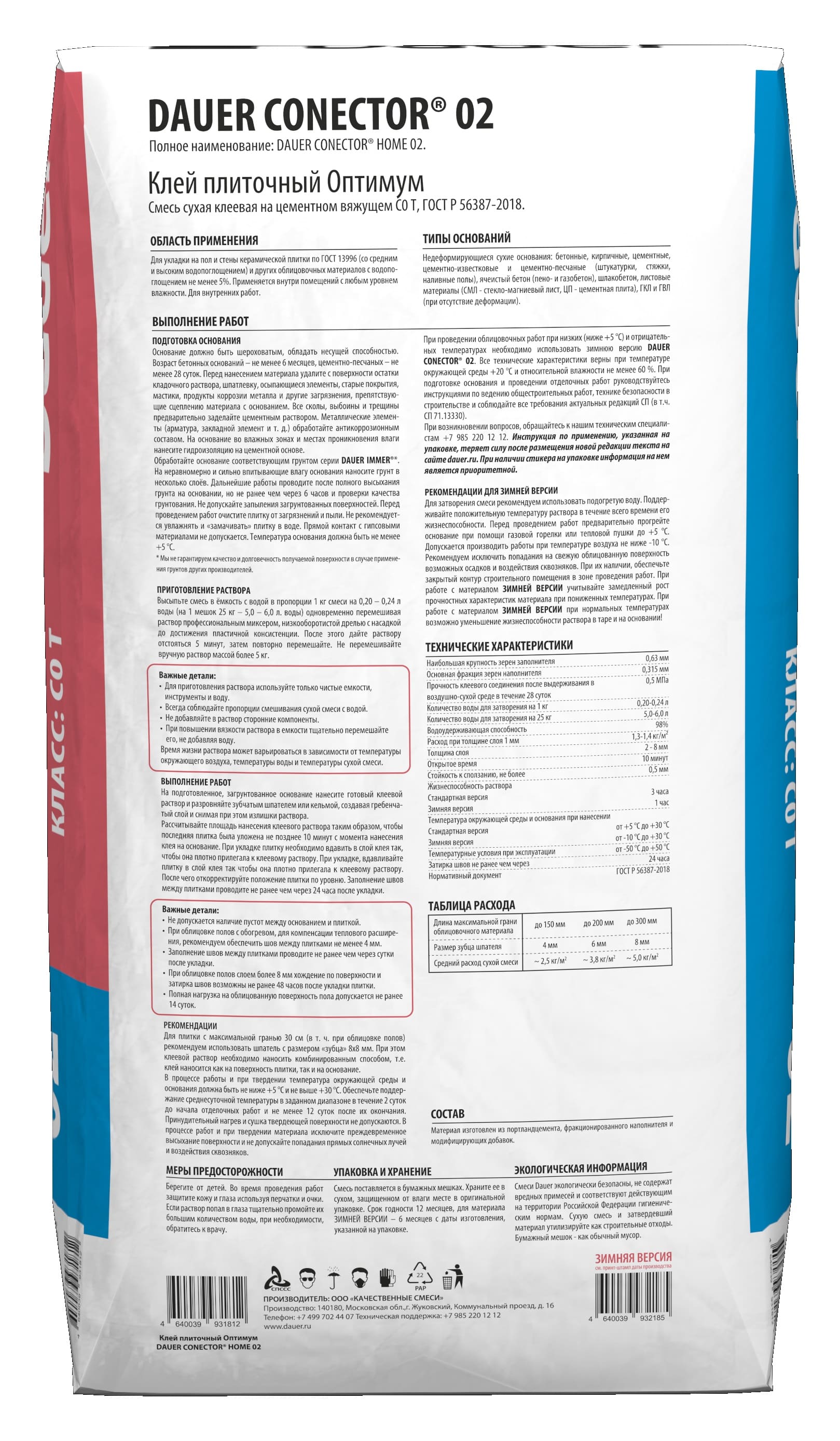 Для укладки на пол и стены плитки (с водопоглощением не менее 5%) и максимальным размером грани не более 30 см. Класс клеевой смеси по ГОСТ 56387-2018 - C0T.
