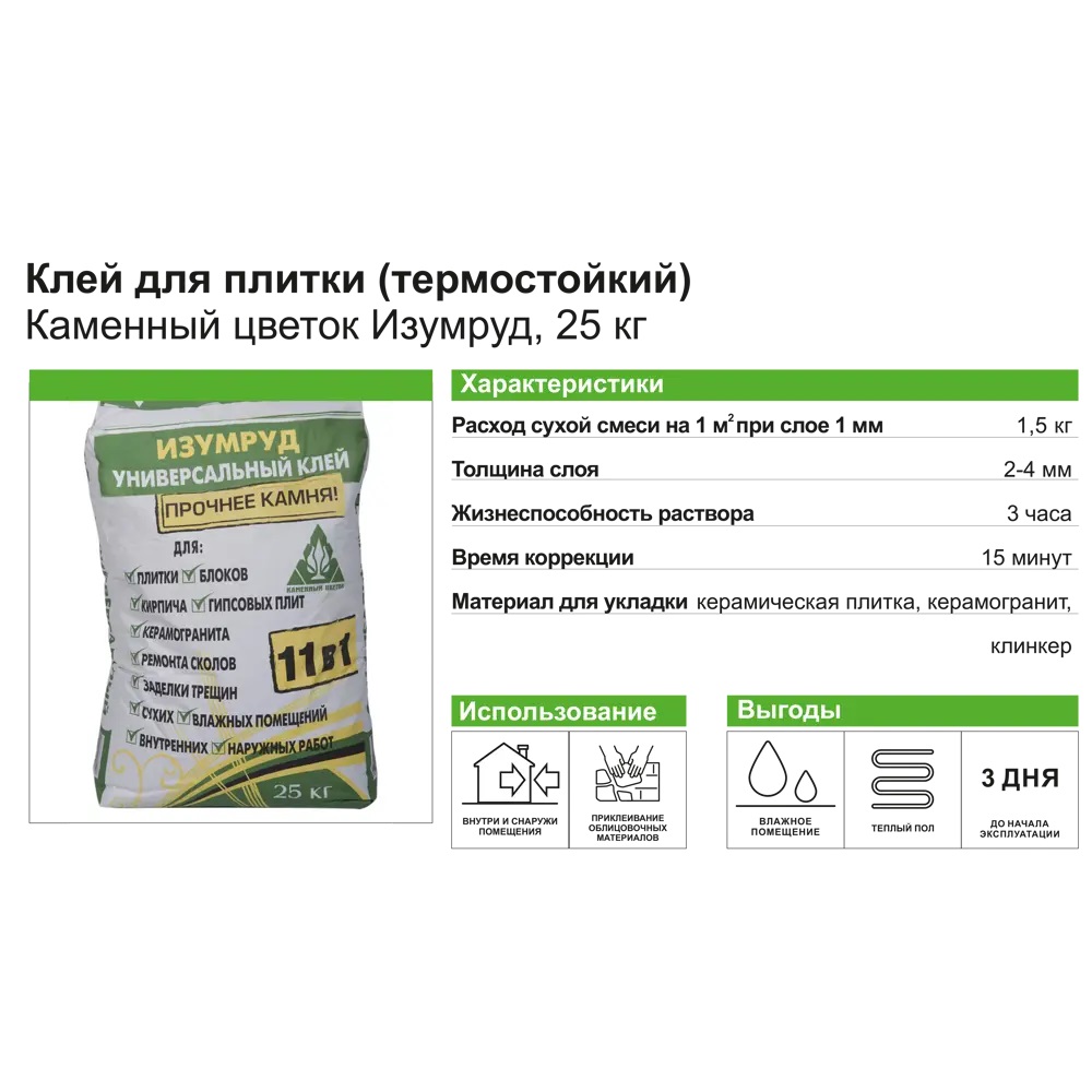 Плиточный клей для внутренних и наружных работ. Класс клеевой смеси по ГОСТ 56387-2018 - C1.
