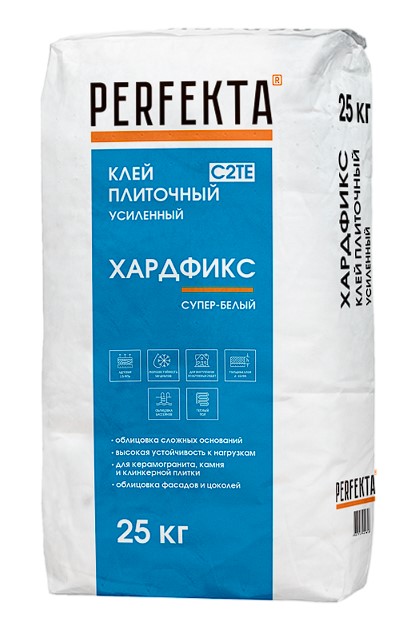 PERFEKTA Хардфикс супер-белый плиточный клей класса C2 TE, обладает, обладает морозостойкостью 50 циклов, можно использовать в системе теплый пол, Толщина нанесения 2-15 мм.